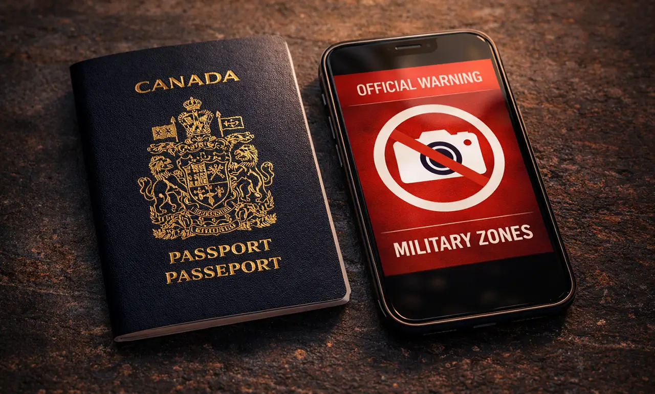 دولت کانادا تاکید کرده است که همراه داشتن یا اشتراکگذاری عکس و ویدئو از سایتهای نظامی، تجهیزات یا آسیبهای جنگی میتواند منجر به جریمه مالی، حبس یا دیپورت شود.